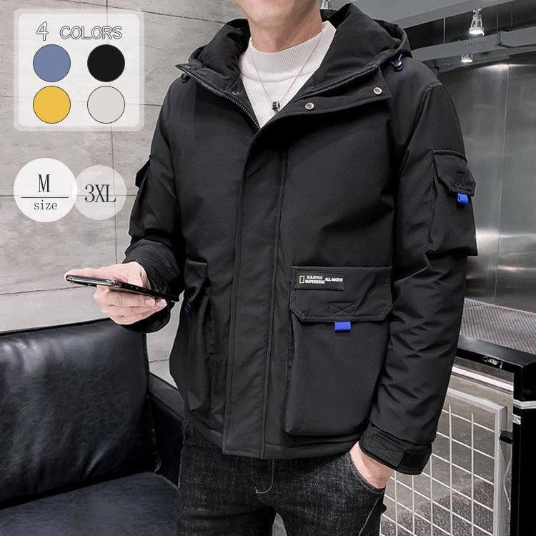 「予約商品」送料無料 メンズ ダウンジャケット 中綿ジャケット 暖かい ダウン ダウンコート パーカー あたたかい 黒 中綿 秋 冬 冬物 防寒 M-3XL カジュアル コート アウター ブラック イエロー カーキ ブルー おしゃれ 彼氏 全4色 シンプル フード付き(jk170)