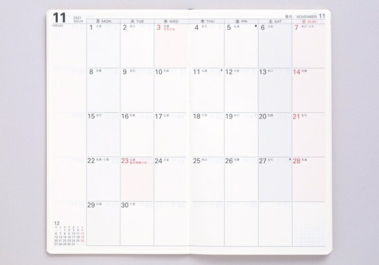 月全体の予定が把握しやすく、土日祝日がひと目でわかるデザインです。
